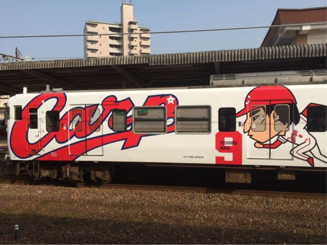 広島城から宮島に向かったら、カープ電車、発見!