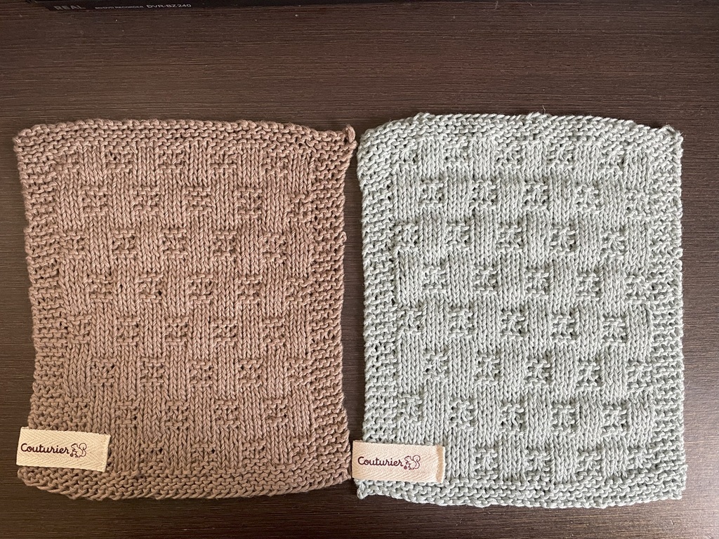 すべり目で糸が引っ張られる感じになってサイズも変わってしまったので、2回目は少しゆるめに編んだのが右側。引きつった感じはなくなったものの、模様としては左のほうが綺麗に出ているような気がします。