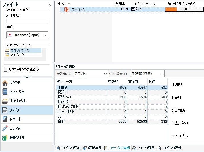 まず、プロジェクトを少し作業したところで、ファイルのステータス情報を見ると、未翻訳=7097ワードとなっています。これは作業前と同じ値です(泣)。