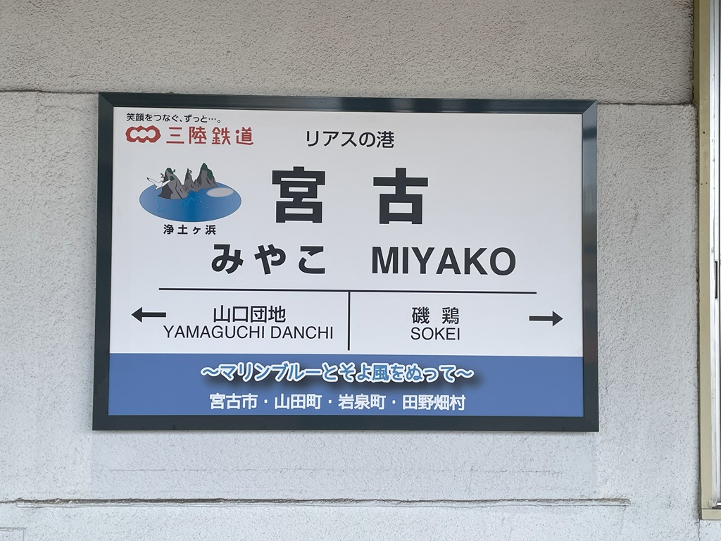 宮古駅は昨日下りた三陸鉄道の宮古駅と同じですが、「三陸鉄道の黒字化を応援するクロジカ君」を見つけたので撮っておきました。