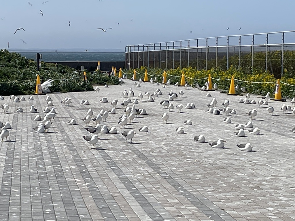 (遠くから見て、「あれ全部ウミネコじゃないよね? 白い石? オブジェ?」と思ってたら全部ウミネコだった!)