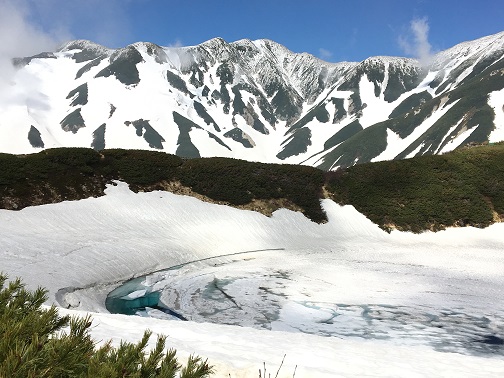 ほとんど雪と氷に覆われていましたが、少しだけ青い水が見えていました。