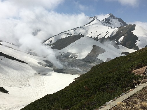 黒部平の駅の屋上展望台から大観峰を見ると、