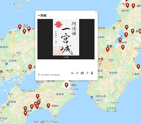 Google マイマップに御城印をもらった城の位置をマークし、御城印の写真を付けるという方式です。これだと限定版の御城印など、複数の御城印を貰った場合もどんな図柄かわかるので便利です。