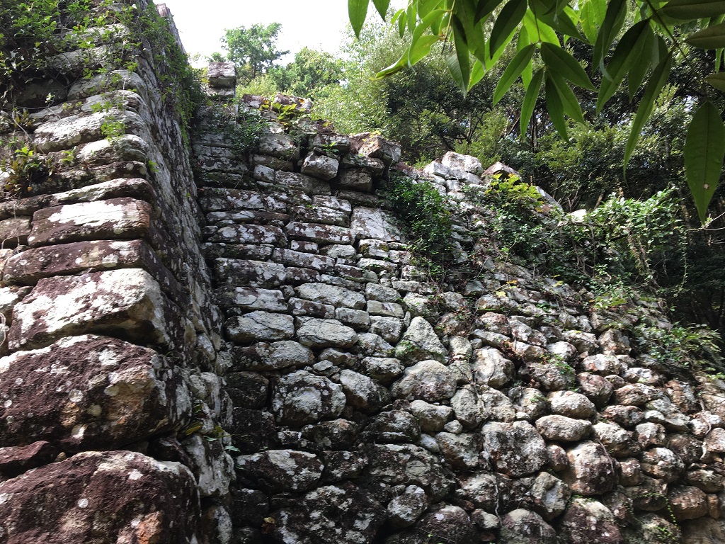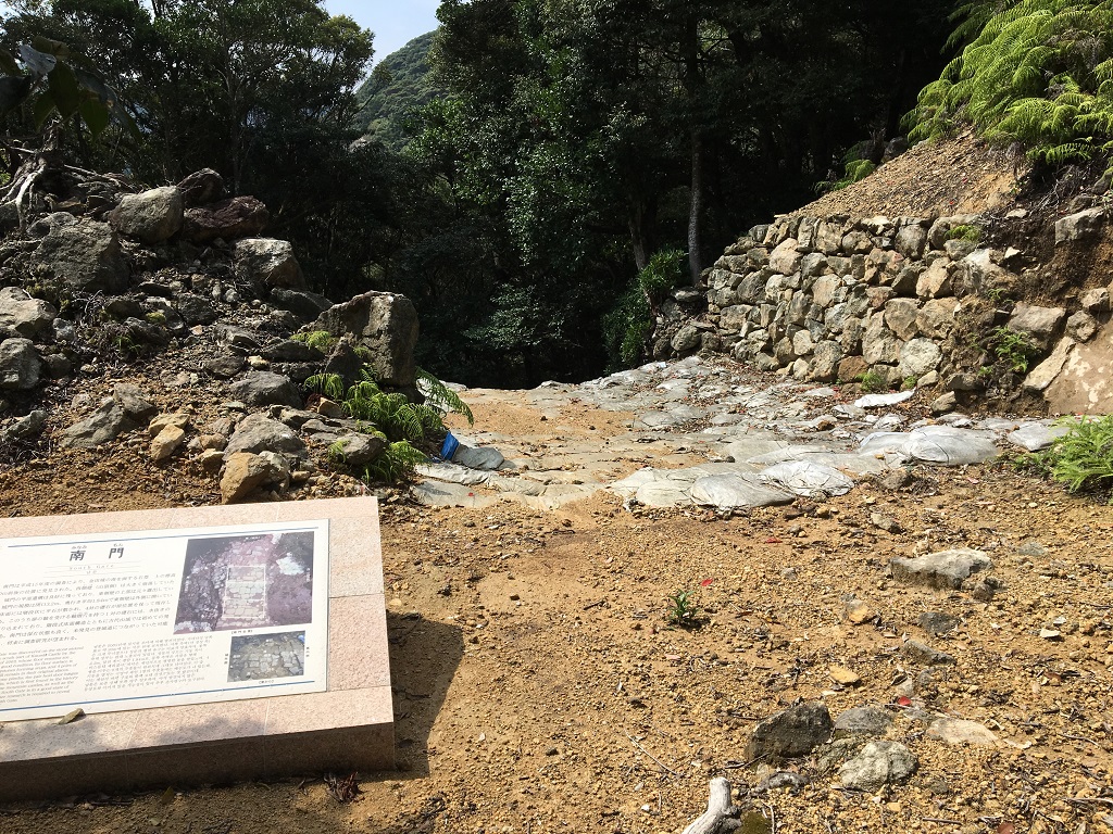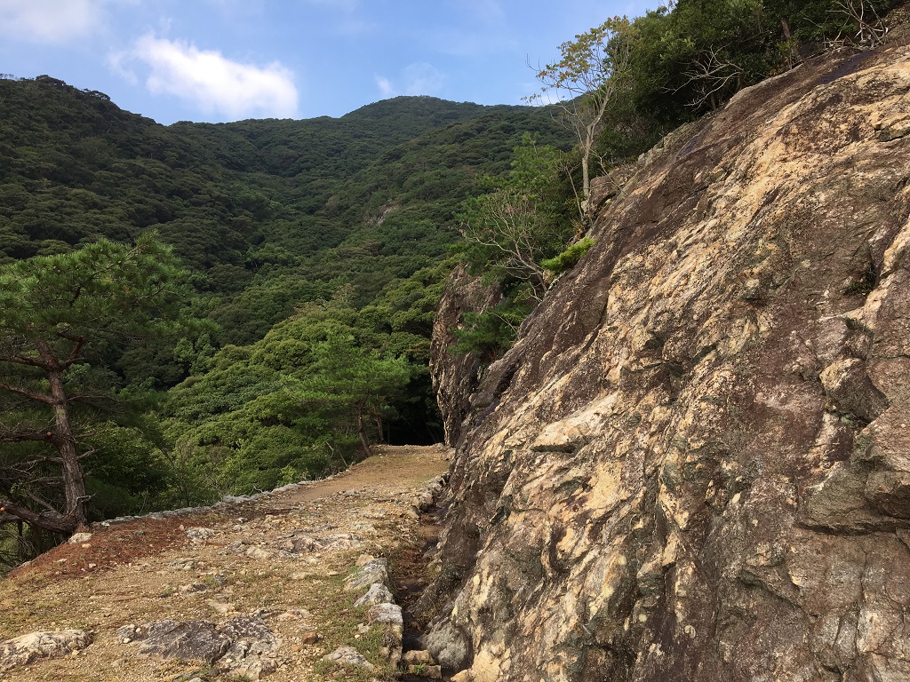 ここから、最初に見た「金田城壁石垣」まで登っていくのですが、三の城戸からそこまでの上りで、かなりへとへとになりました(距離的にはそれほどではないのですが、それまでにもかなりアップダウンがあったので)。^^;