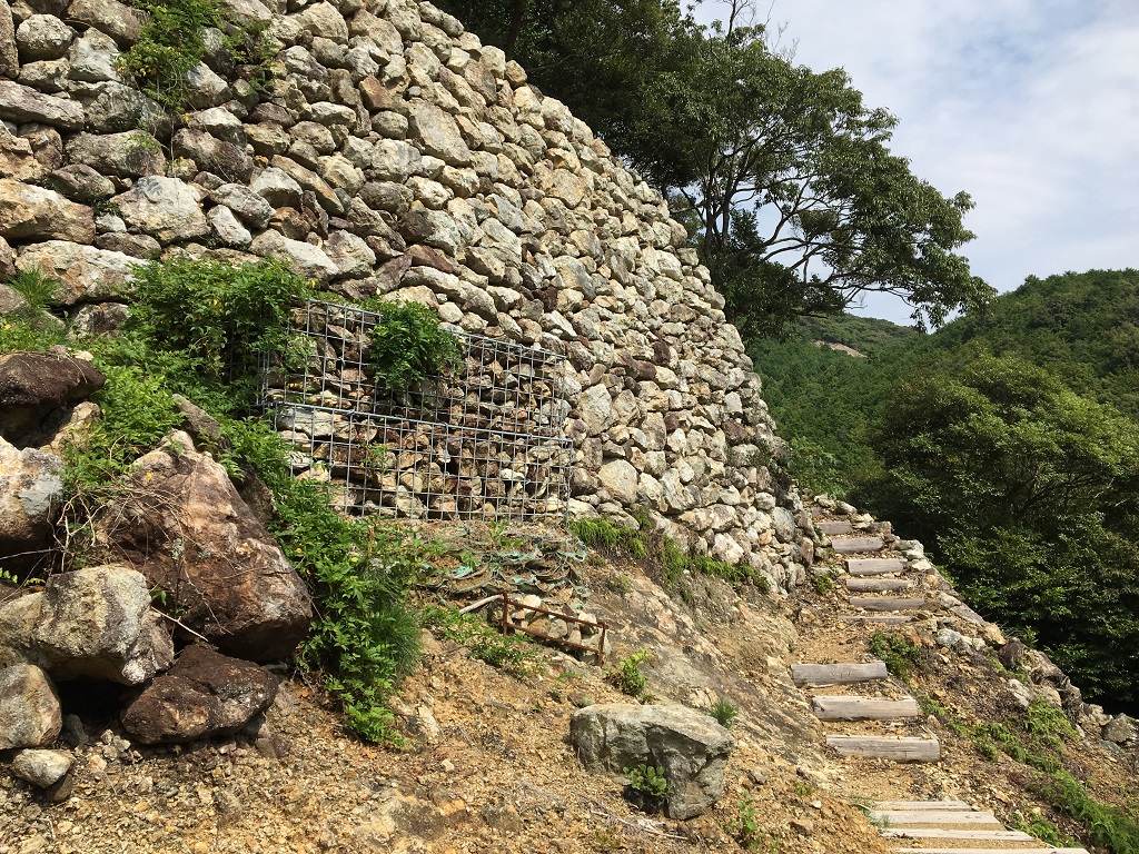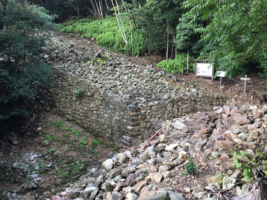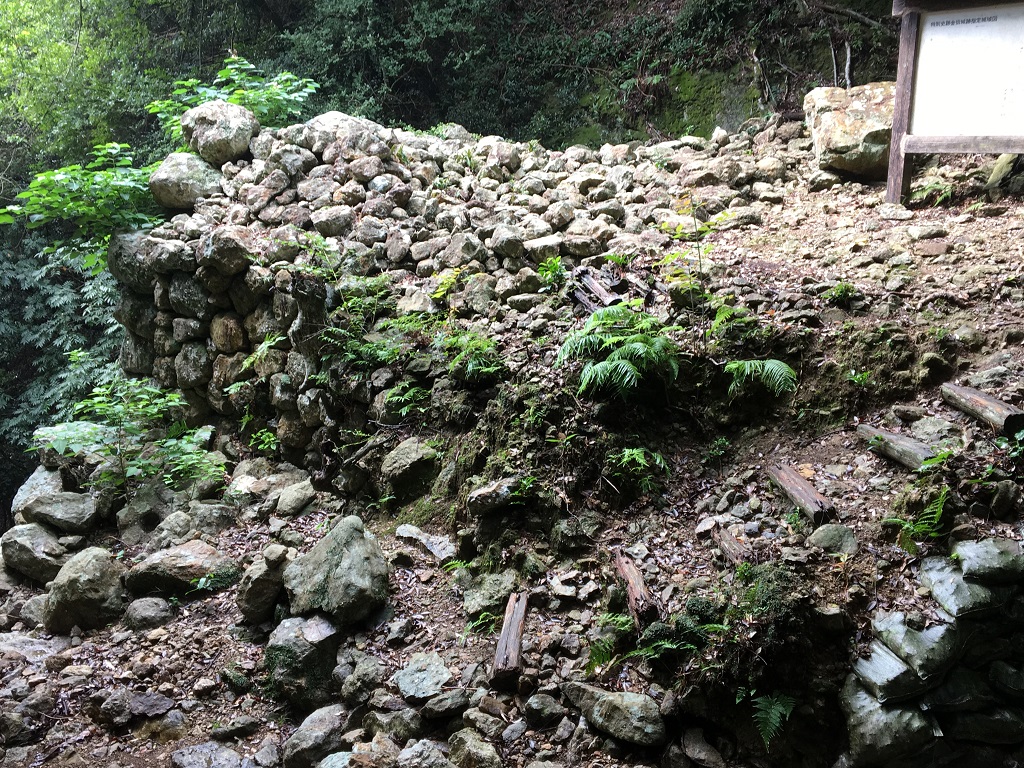 てっきり看板だと思って、この右手にある崩れかけた石垣が城壁だと思っていたのですが、実はこの矢印(石垣)に沿って降りていくと、城壁と三の城戸があるのでした。