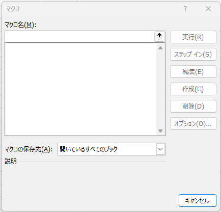 [開発] タブで [マクロ] をクリックしても、下記のように何も表示されない状態でした。どちらのファイルも長年使用しているもので、マクロは自作の VBA です。
