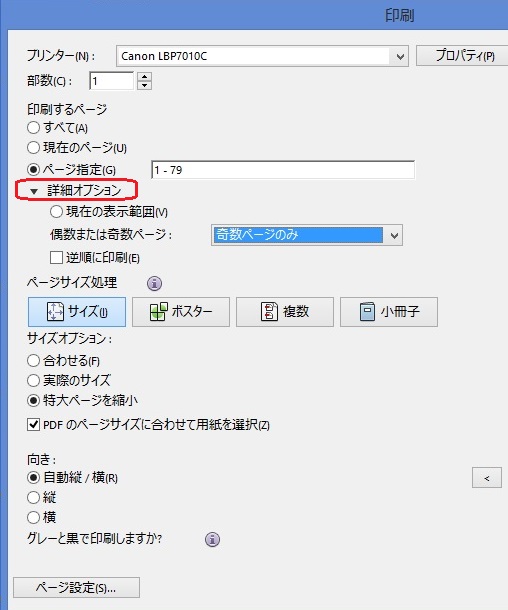 印刷のポップアップメニューで、[詳細オプション] をクリックすると、[偶数または奇数ページ] の項目で、[奇数ページのみ] または [偶数ページのみ] を選択できます。