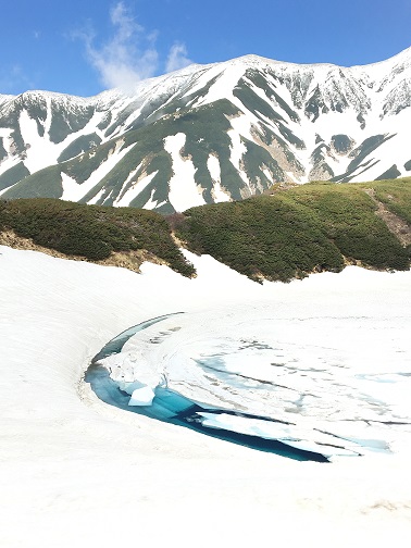 ほとんど雪と氷に覆われていましたが、少しだけ青い水が見えていました。