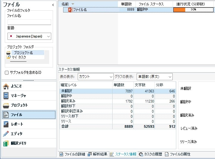 まず、プロジェクトを少し作業したところで、ファイルのステータス情報を見ると、未翻訳=7097ワードとなっています。これは作業前と同じ値です(泣)。