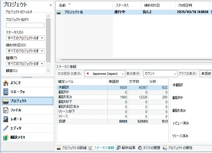 ところが、[プロジェクト] でステータス情報を見ると、未翻訳=6929ワードとなっていて、ちゃんと進んでいることがわかります。