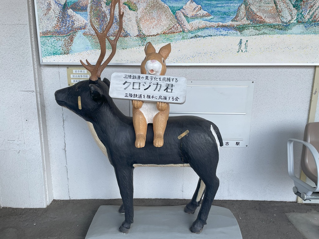 宮古駅は昨日下りた三陸鉄道の宮古駅と同じですが、「三陸鉄道の黒字化を応援するクロジカ君」を見つけたので撮っておきました。