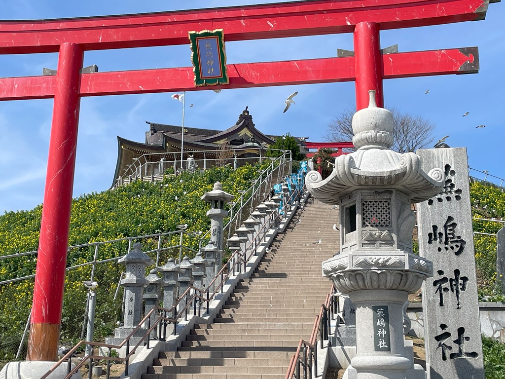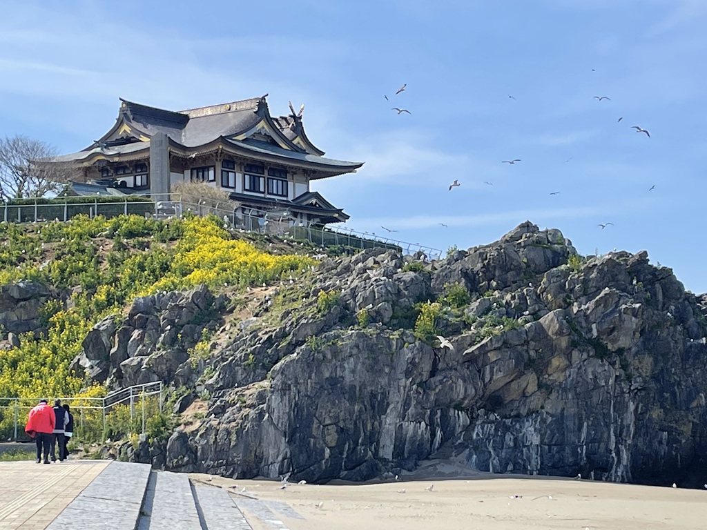 ウミネコの繁殖地として知られているところですが、遠くからすでに神社の周りを飛ぶウミネコが見えていました。