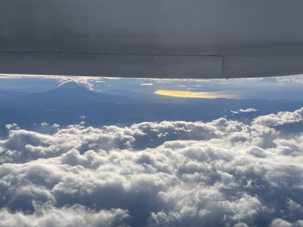 まず、行きの飛行機で、朝日に輝く駿河湾と富士山の絶景!