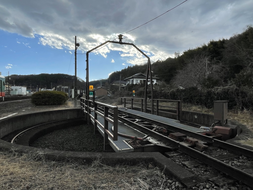 茂木駅の2階からSLを見下ろすことができます。転車台も見えます(手前は別の列車)。